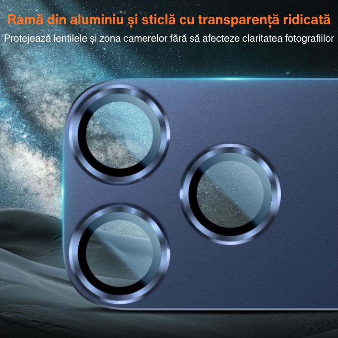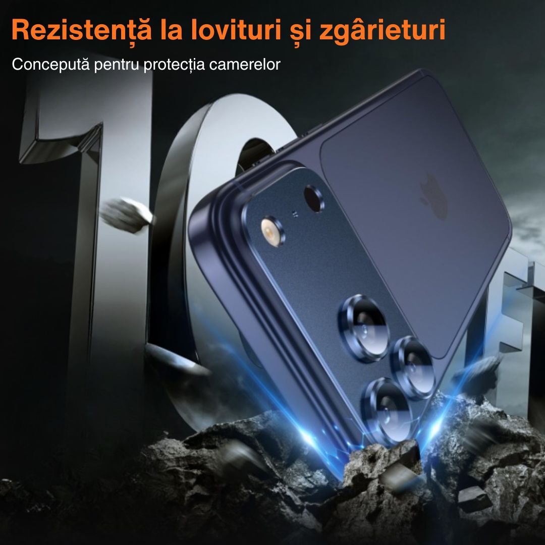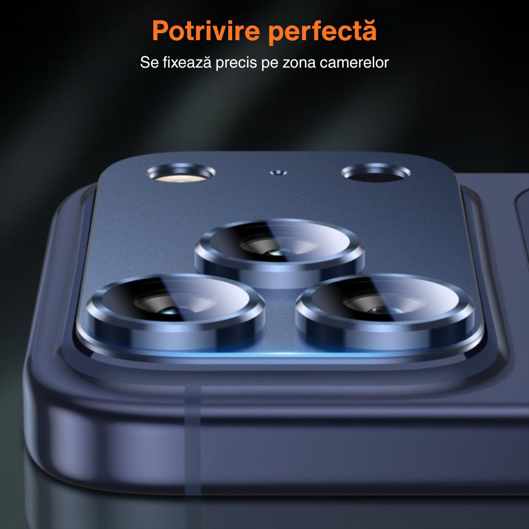 Protecție pentru camere compatibilă cu iPhone 17 Pro Max, concepută pentru a proteja lentilele și zona camerei împotriva loviturilor, zgârieturilor, prafului și uzurii zilnice. Se fixează precis pe modulul camerei și ajută la păstrarea clarității fotografiilor și videoclipurilor.