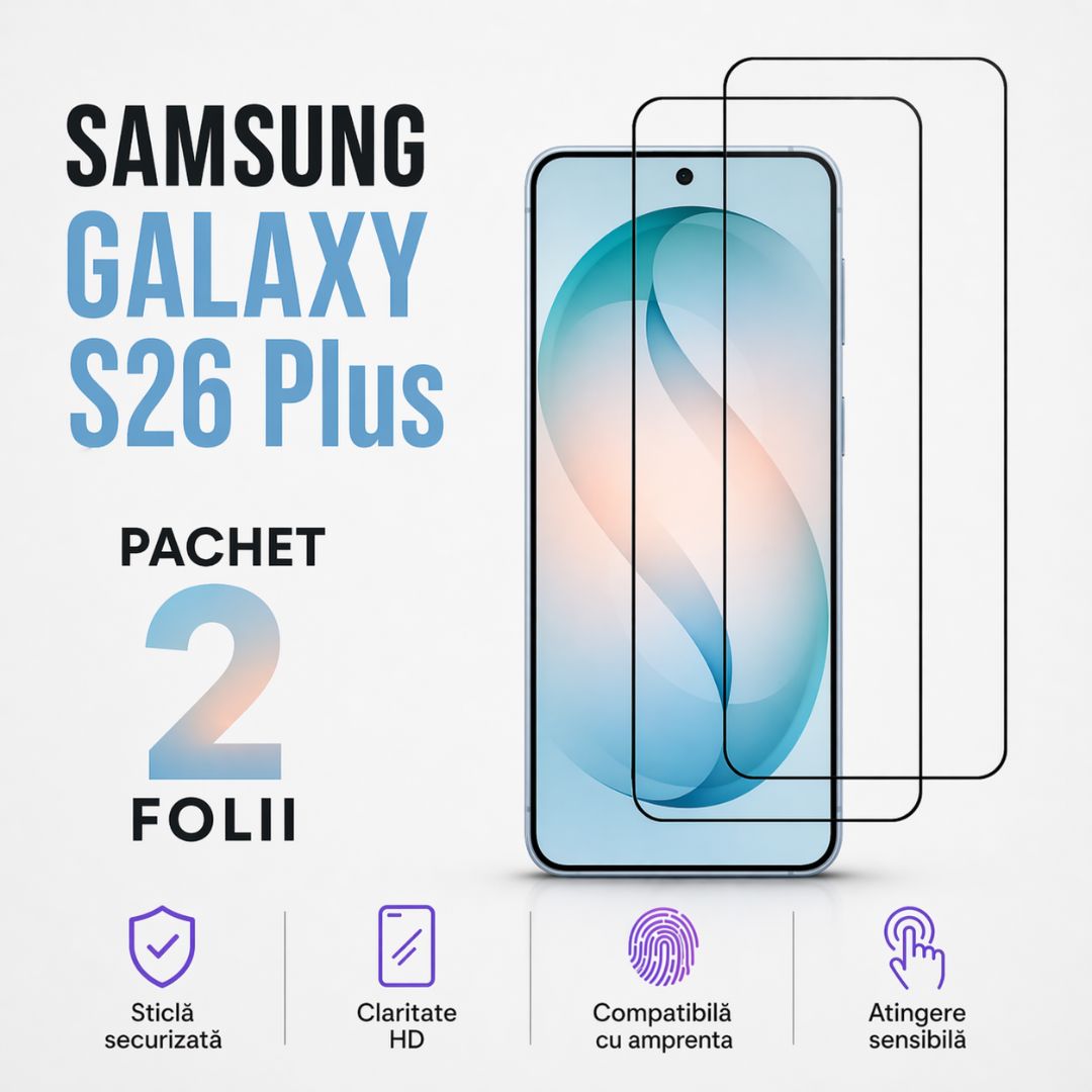 Protejează ecranul telefonului tău cu Setul de 2 Folii de Protecție din Sticlă Securizată pentru Samsung Galaxy S26+ (Plus). Aceste folii sunt concepute pentru a oferi protecție eficientă împotriva zgârieturilor, șocurilor și uzurii zilnice, păstrând în același timp claritatea ecranului și funcționarea normală a touch-ului.