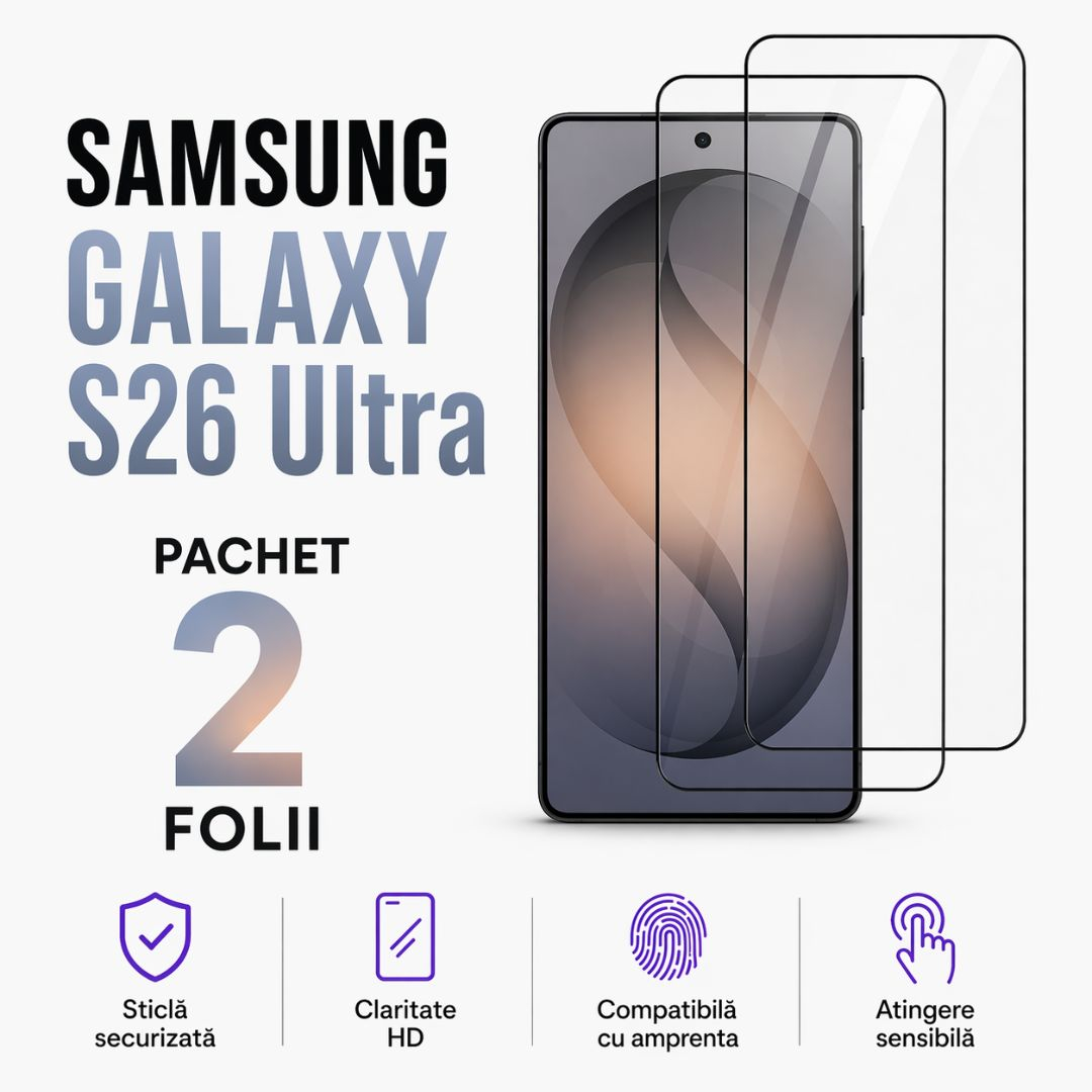 Protejează ecranul telefonului tău cu Setul de 2 Folii de Protecție din Sticlă Securizată pentru Samsung Galaxy S26 Ultra. Aceste folii sunt concepute pentru a oferi protecție eficientă împotriva zgârieturilor, șocurilor și uzurii zilnice, păstrând în același timp claritatea ecranului și funcționarea normală a touch-ului.